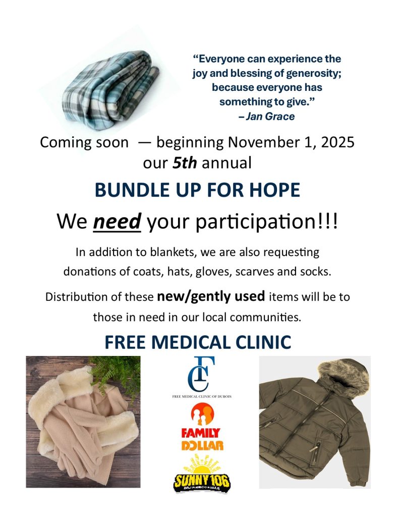 Please help us for our 5th annual BUNDLE UP FOR HOPE BLANKET DRIVE. We will be collecting NEW/GENTLY USED blankets, coats, hats, gloves, scarves, and socks for our local community in need. Starting November 1st we will kick off our collection. Thank you Sunny 106, along with the Family Dollar Stores both of DuBois and Weedville for your support.