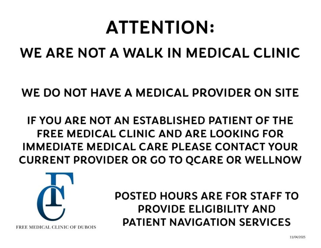 The Free Medical Clinic of DuBois, Inc. is an established health clinic that has provided free primary healthcare services, pharmaceuticals, diagnostic testing and specialty referral services to low-income uninsured residents of the tri-county region. The Free Medical Clinic has provided $22 million dollars of free medical services to the underserved, vulnerable residents in the surrounding communities.